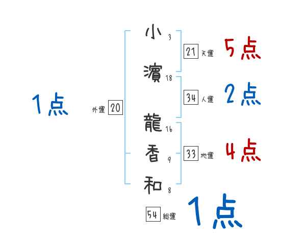 天運![]() | 小濵龍香和さんの天運は21画の5つ星!統率力がある。独立し成功する。名誉を手に入れる。 家系が持つ宿命的な運勢を表します。祖先から受け継いだ苗字ですので自分の力が及びません。家柄を象徴します。 |