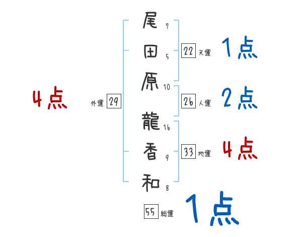 外運![]() | 尾田原龍香和さんの外運は29画の4つ星!完全主義で才能がある。厳格な心の持ち主。 生活面を象徴する運勢です。外部から受ける影響力を表し、結婚運、家庭運や職場、環境への順応性を表します。 |