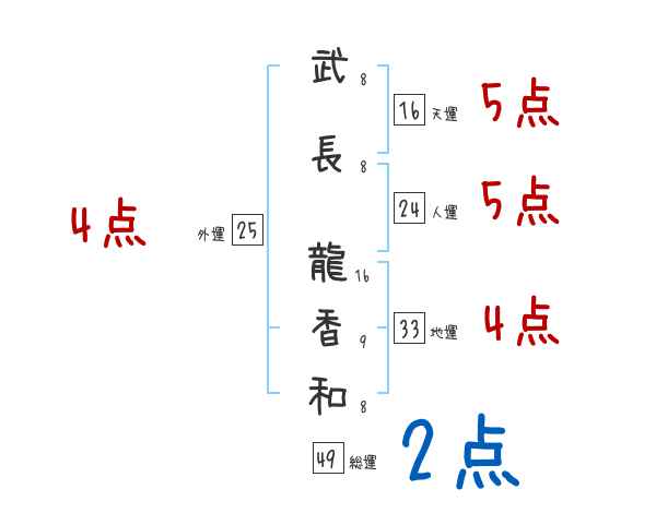 天運![]() | 武長龍香和さんの天運は16画の5つ星!人望が厚く大きく発展する。逆転成功が見える。 家系が持つ宿命的な運勢を表します。祖先から受け継いだ苗字ですので自分の力が及びません。家柄を象徴します。 |
