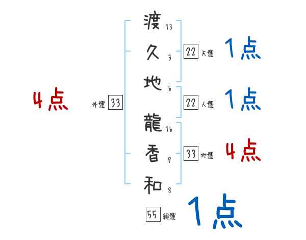 天運![]() | 渡久地龍香和さんの天運は22画の1つ星!努力することが苦手ないっぽう手先が器用。芸術性にも優れる。 家系が持つ宿命的な運勢を表します。祖先から受け継いだ苗字ですので自分の力が及びません。家柄を象徴します。 |