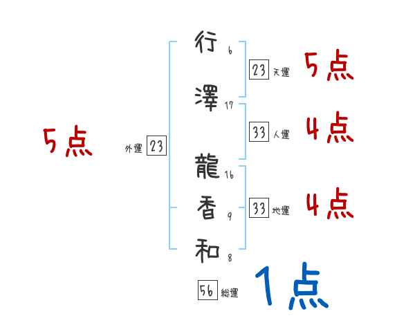 天運![]() | 行澤龍香和さんの天運は23画の5つ星!想像力に優れ活力がある。一代で成功し名誉を手に入れる。 家系が持つ宿命的な運勢を表します。祖先から受け継いだ苗字ですので自分の力が及びません。家柄を象徴します。 |