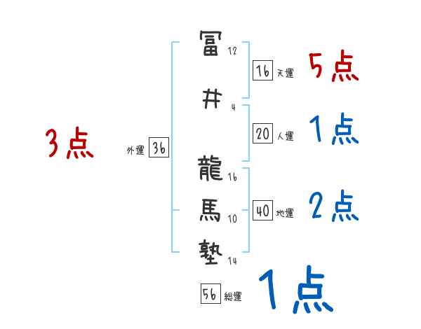 天運![]() | 冨井龍馬塾さんの天運は16画の5つ星!人望が厚く大きく発展する。逆転成功が見える。 家系が持つ宿命的な運勢を表します。祖先から受け継いだ苗字ですので自分の力が及びません。家柄を象徴します。 |