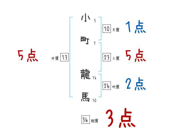 総運![]() | 小町龍馬さんの総運は36画の3つ星!先見性が豊かです。多少神経質で苦労することも。 あなたの人生を表す1番重要な運勢です。生涯を通じて影響する総合運となり、主に50歳以降の晩年期に影響を及ぼします。 |