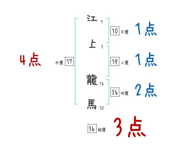 外運![]() | 江上龍馬さんの外運は17画の4つ星!積極的な行動力。地位を気づき財産を手に入れる。純粋な心と直感力。 生活面を象徴する運勢です。外部から受ける影響力を表し、結婚運、家庭運や職場、環境への順応性を表します。 |
