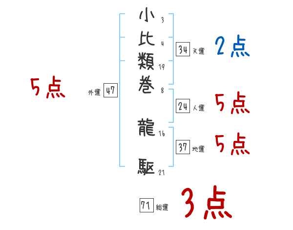 外運![]() | 小比類巻龍駆さんの外運は47画の5つ星!実力が開花し発展する円満な人生。財に恵まれる。 生活面を象徴する運勢です。外部から受ける影響力を表し、結婚運、家庭運や職場、環境への順応性を表します。 |
