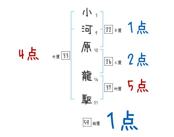 | 天運  | 小河原龍駆さんの天運は22画の1つ星!努力することが苦手ないっぽう手先が器用。芸術性にも優れる。家系が持つ宿命的な運勢を表します。祖先から受け継いだ苗字ですので自分の力が及びません。家柄を象徴します。 |
