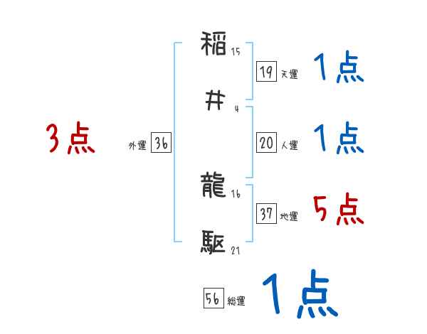 外運![]() | 稲井龍駆さんの外運は36画の3つ星!先見性が豊かです。多少神経質で苦労することも。 生活面を象徴する運勢です。外部から受ける影響力を表し、結婚運、家庭運や職場、環境への順応性を表します。 |