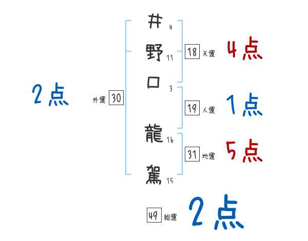 天運![]() | 井野口龍駕さんの天運は18画の4つ星!情熱的で剛気。忍耐力があり信頼される。 家系が持つ宿命的な運勢を表します。祖先から受け継いだ苗字ですので自分の力が及びません。家柄を象徴します。 |