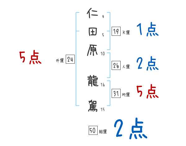 総運![]() | 仁田原龍駕さんの総運は50画の2つ星!浮き沈みが激しく不安定。しりすぼみに衰退しやすいので注意しましょう。 あなたの人生を表す1番重要な運勢です。生涯を通じて影響する総合運となり、主に50歳以降の晩年期に影響を及ぼします。 |