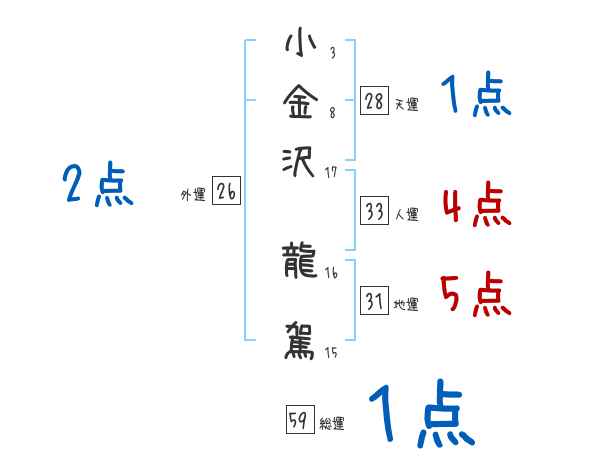 外運![]() | 小金沢龍駕さんの外運は26画の2つ星!波瀾万丈かも。信頼できる人を大事にしましょう。 生活面を象徴する運勢です。外部から受ける影響力を表し、結婚運、家庭運や職場、環境への順応性を表します。 |