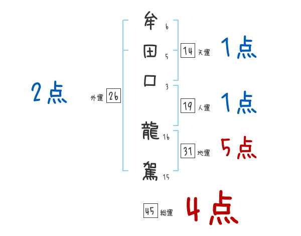 外運![]() | 牟田口龍駕さんの外運は26画の2つ星!波瀾万丈かも。信頼できる人を大事にしましょう。 生活面を象徴する運勢です。外部から受ける影響力を表し、結婚運、家庭運や職場、環境への順応性を表します。 |