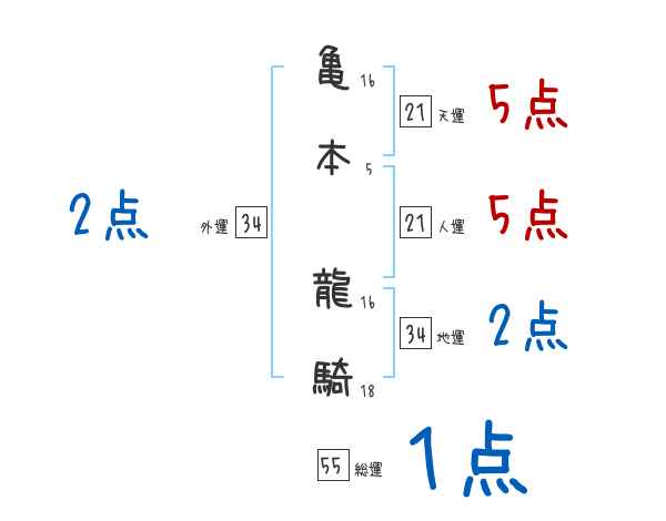 天運![]() | 亀本龍騎さんの天運は21画の5つ星!統率力がある。独立し成功する。名誉を手に入れる。 家系が持つ宿命的な運勢を表します。祖先から受け継いだ苗字ですので自分の力が及びません。家柄を象徴します。 |
