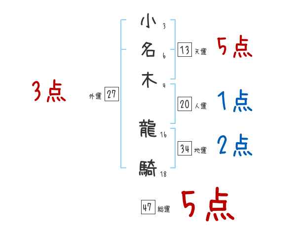 天運![]() | 小名木龍騎さんの天運は13画の5つ星!才能に恵まれ人気がある。名声を手に入れる。円満な人生。 家系が持つ宿命的な運勢を表します。祖先から受け継いだ苗字ですので自分の力が及びません。家柄を象徴します。 |