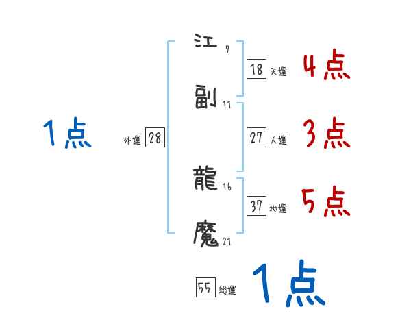 外運![]() | 江副龍魔さんの外運は28画の1つ星!家庭環境に注意。スポーツで活躍できる能力があるかも。 生活面を象徴する運勢です。外部から受ける影響力を表し、結婚運、家庭運や職場、環境への順応性を表します。 |
