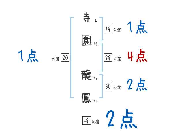 人運![]() | 寺園龍鳳さんの人運は29画の4つ星!完全主義で才能がある。厳格な心の持ち主。 性格や才能などを表す2番目に重要な運勢です。人間関係や協調性、社会的な成功に影響します。主に20歳から50歳ぐらいまでの中年期の運勢を表します。 |