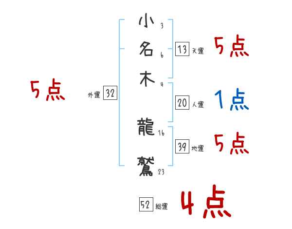 外運![]() | 小名木龍鷲さんの外運は32画の5つ星!柔軟性があり成功する。チャンスが多く金運が良い。 生活面を象徴する運勢です。外部から受ける影響力を表し、結婚運、家庭運や職場、環境への順応性を表します。 |