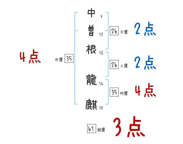 外運![]() | 中曽根龍麒さんの外運は35画の4つ星!温厚な性格で感受性が高い。穏和な性格で人望が厚い。 生活面を象徴する運勢です。外部から受ける影響力を表し、結婚運、家庭運や職場、環境への順応性を表します。 |