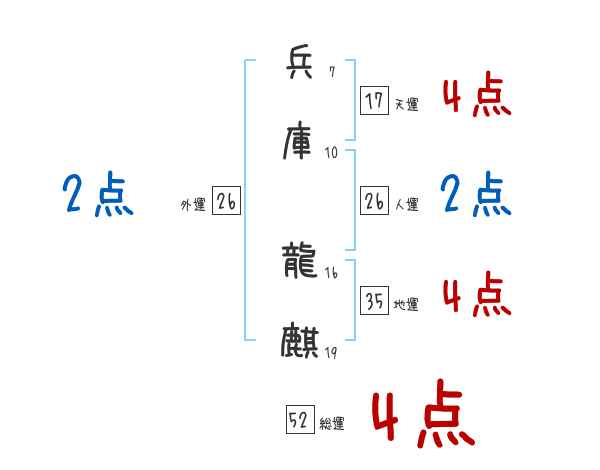 外運![]() | 兵庫龍麒さんの外運は26画の2つ星!波瀾万丈かも。信頼できる人を大事にしましょう。 生活面を象徴する運勢です。外部から受ける影響力を表し、結婚運、家庭運や職場、環境への順応性を表します。 |