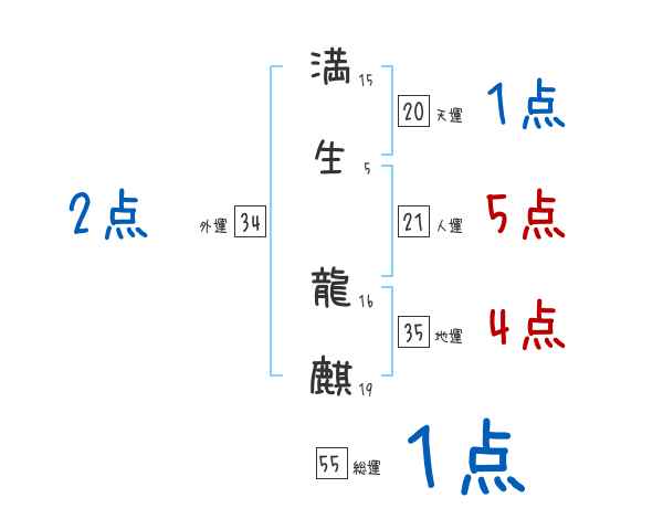 地運![]() | 満生龍麒さんの地運は35画の4つ星!温厚な性格で感受性が高い。穏和な性格で人望が厚い。 個性を表す基礎的な運勢です。性格形成や対人関係、行動力など家庭環境に影響されます。主に誕生してから20歳くらいまでの若年期の運勢を表します。 |
