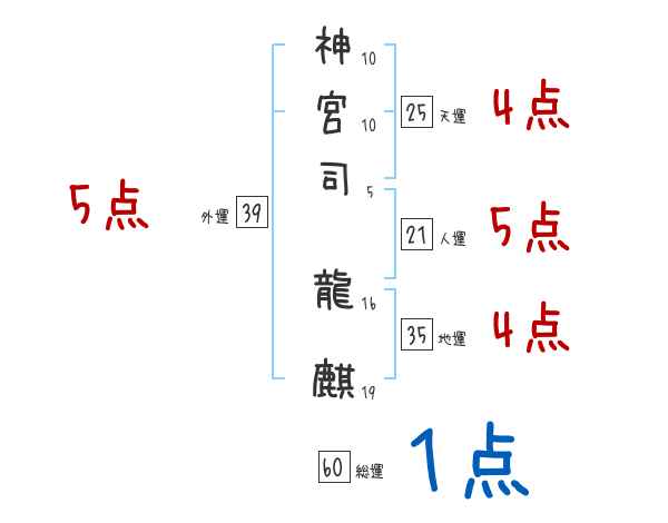 人運![]() | 神宮司龍麒さんの人運は21画の5つ星!統率力がある。独立し成功する。名誉を手に入れる。 性格や才能などを表す2番目に重要な運勢です。人間関係や協調性、社会的な成功に影響します。主に20歳から50歳ぐらいまでの中年期の運勢を表します。 |