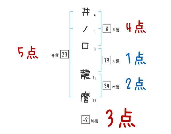 外運![]() | 井ノ口龍麿さんの外運は23画の5つ星!想像力に優れ活力がある。一代で成功し名誉を手に入れる。 生活面を象徴する運勢です。外部から受ける影響力を表し、結婚運、家庭運や職場、環境への順応性を表します。 |