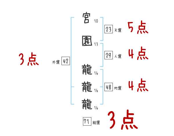 天運![]() | 宮園龍龍龍さんの天運は23画の5つ星!想像力に優れ活力がある。一代で成功し名誉を手に入れる。 家系が持つ宿命的な運勢を表します。祖先から受け継いだ苗字ですので自分の力が及びません。家柄を象徴します。 |