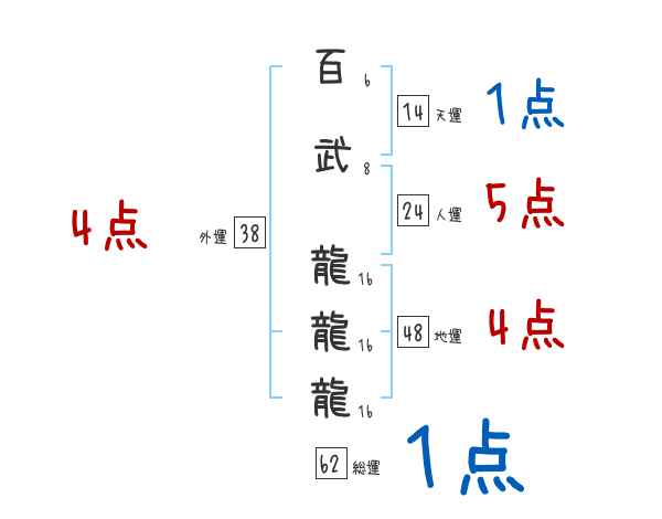 天運![]() | 百武龍龍龍さんの天運は14画の1つ星!人に対して優しいがストレスを溜め込みがち。人間関係のトラブルを避けるよう気をつけましょう。 家系が持つ宿命的な運勢を表します。祖先から受け継いだ苗字ですので自分の力が及びません。家柄を象徴します。 |