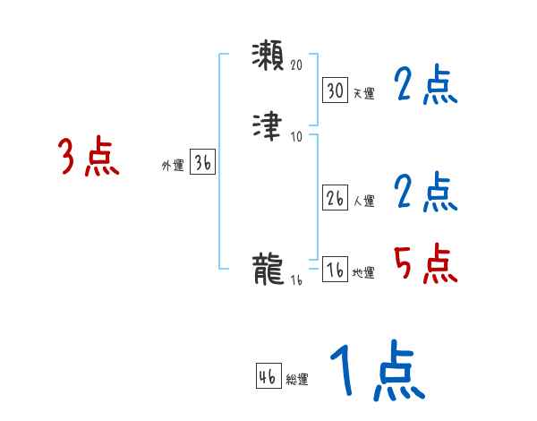 天運![]() | 瀬津龍さんの天運は30画の2つ星!浮き沈みの激しさに注意しましょう。 家系が持つ宿命的な運勢を表します。祖先から受け継いだ苗字ですので自分の力が及びません。家柄を象徴します。 |