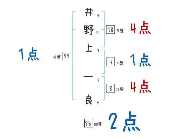 人運![]() | 井野上一良さんの人運は4画の1つ星!感情が不安定で苦労するかも。周囲との協調を心掛けましょう。 性格や才能などを表す2番目に重要な運勢です。人間関係や協調性、社会的な成功に影響します。主に20歳から50歳ぐらいまでの中年期の運勢を表します。 |