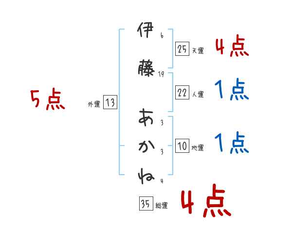 総運![]() | 伊藤あかねさんの総運は35画の4つ星!温厚な性格で感受性が高い。穏和な性格で人望が厚い。 あなたの人生を表す1番重要な運勢です。生涯を通じて影響する総合運となり、主に50歳以降の晩年期に影響を及ぼします。 |